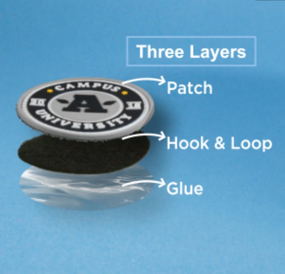Our Velcro® emblems have 3 layers: 1. Heat Seal glue backing for heat application on garments 2. Hook and Loop that allows you to reuse and interchange designs 3. Your patch of choice in a regular shape