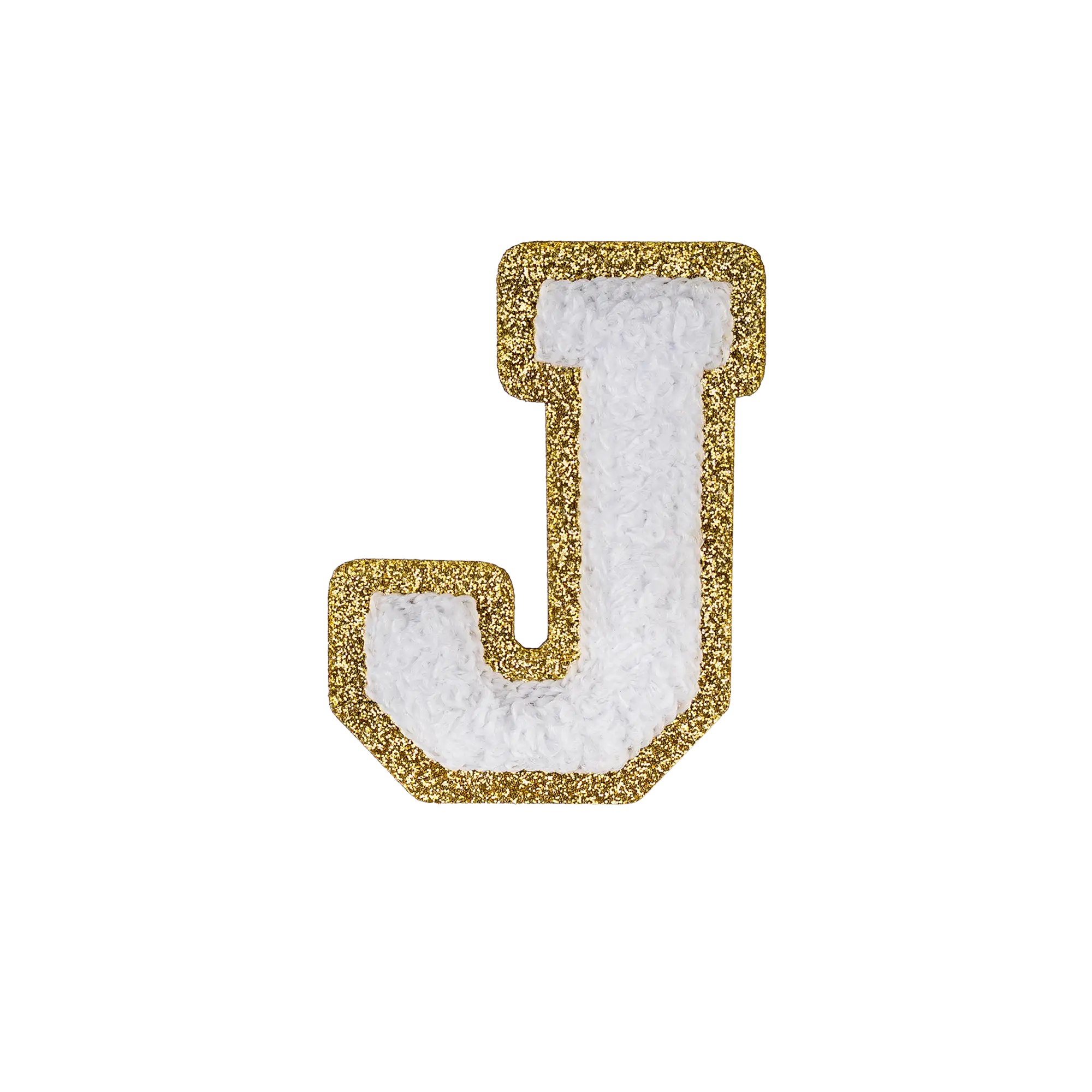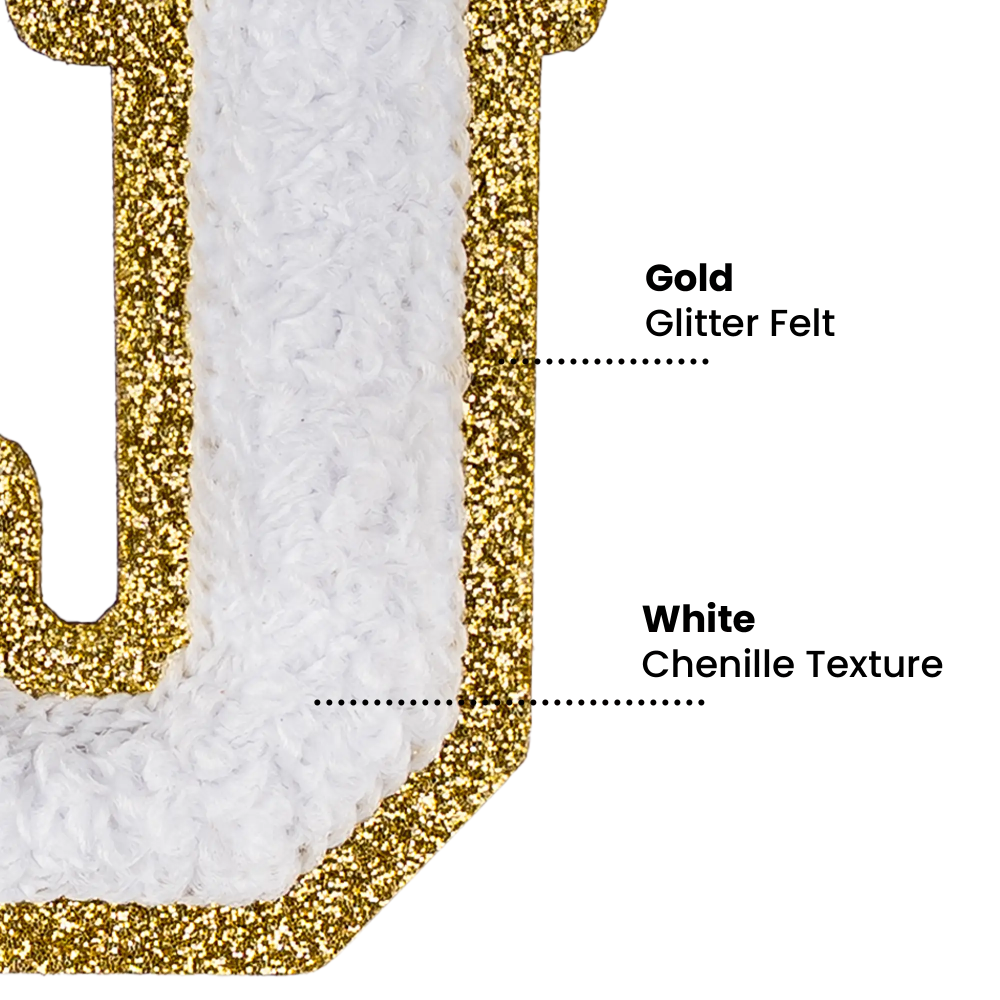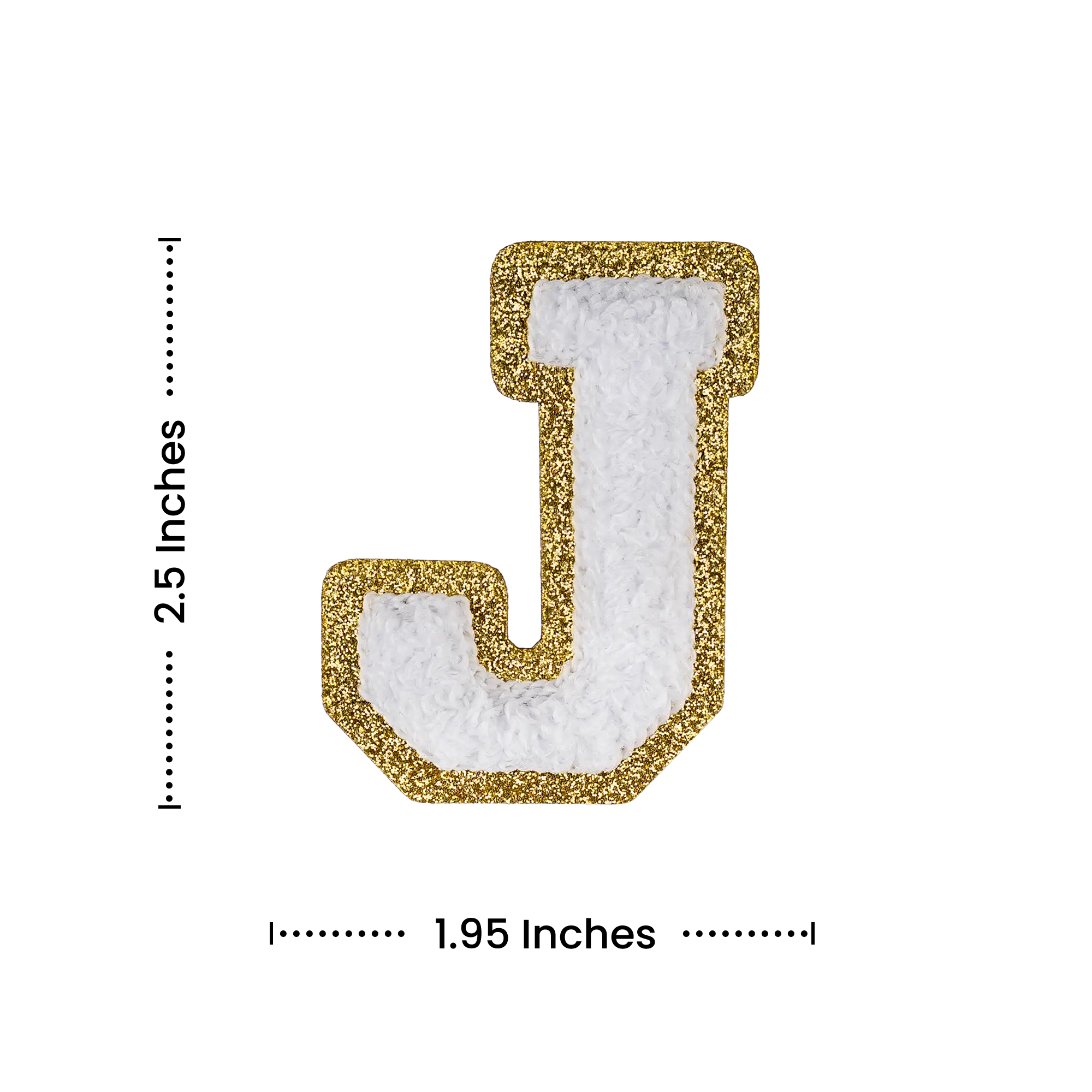 Pack of 25 - 2.5" - Chenille Letterman "J" Patch - White Chenille Thread/Gold Glitter Felt - Heat Applied Backing
