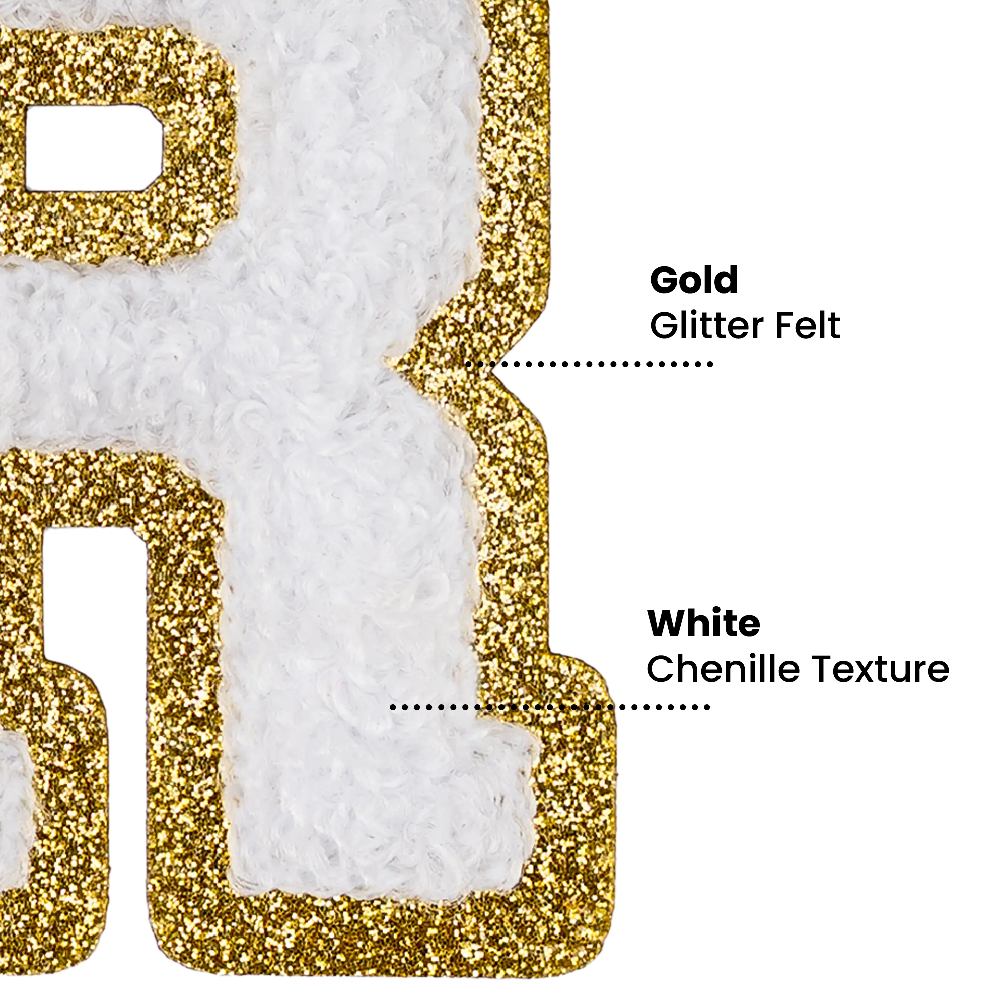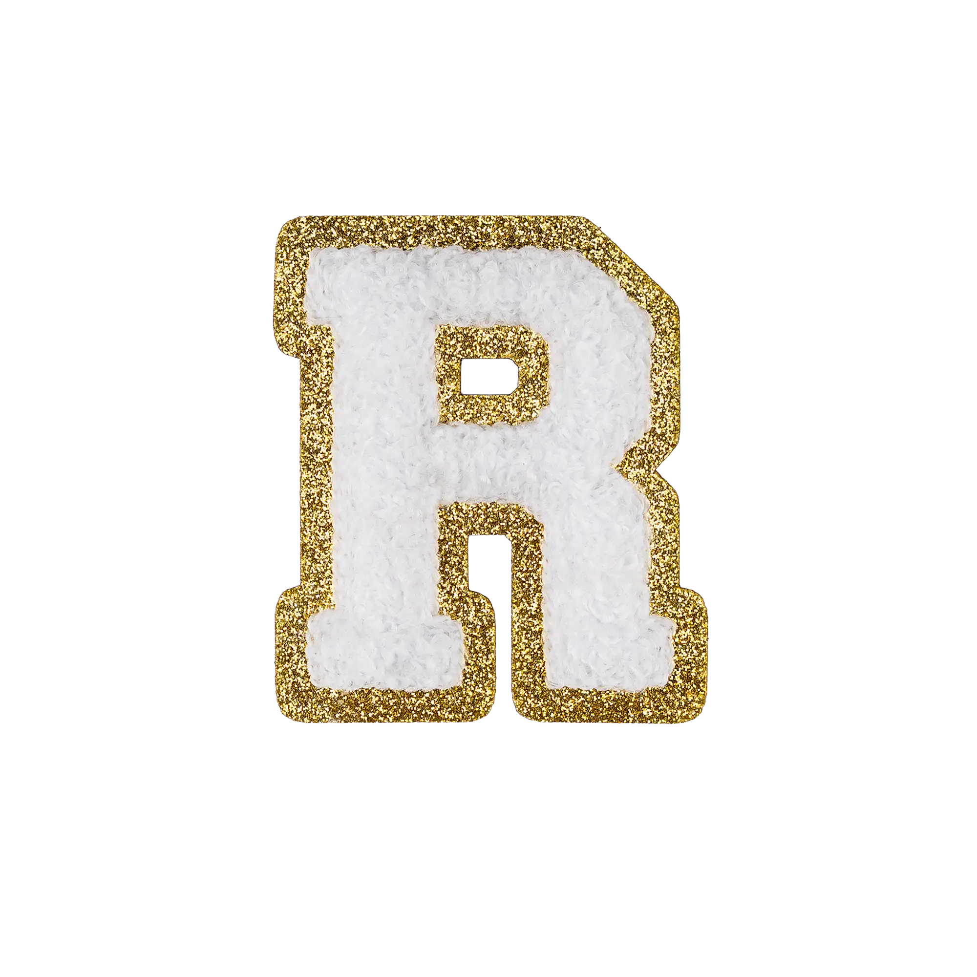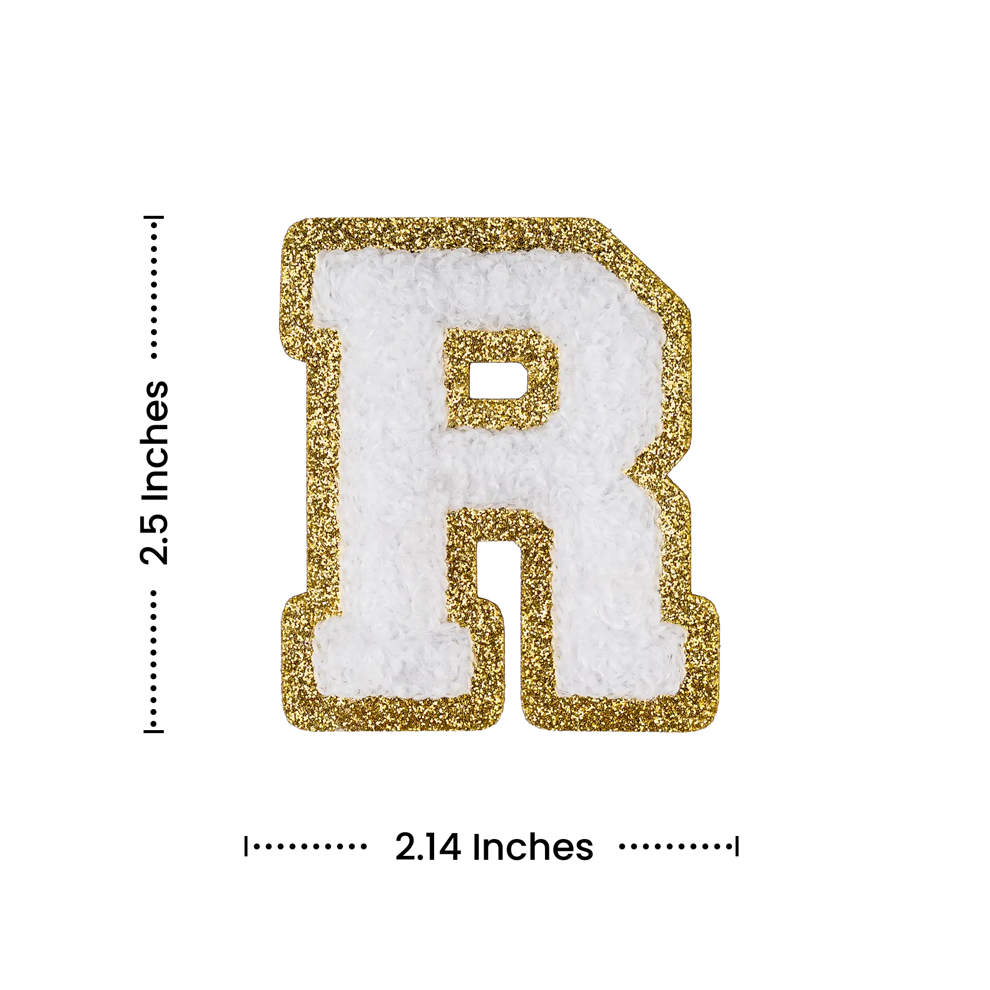 Pack of 25 - 2.5" - Chenille Letterman "R" Patch - White Chenille Thread/Gold Glitter Felt - Heat Applied Backing