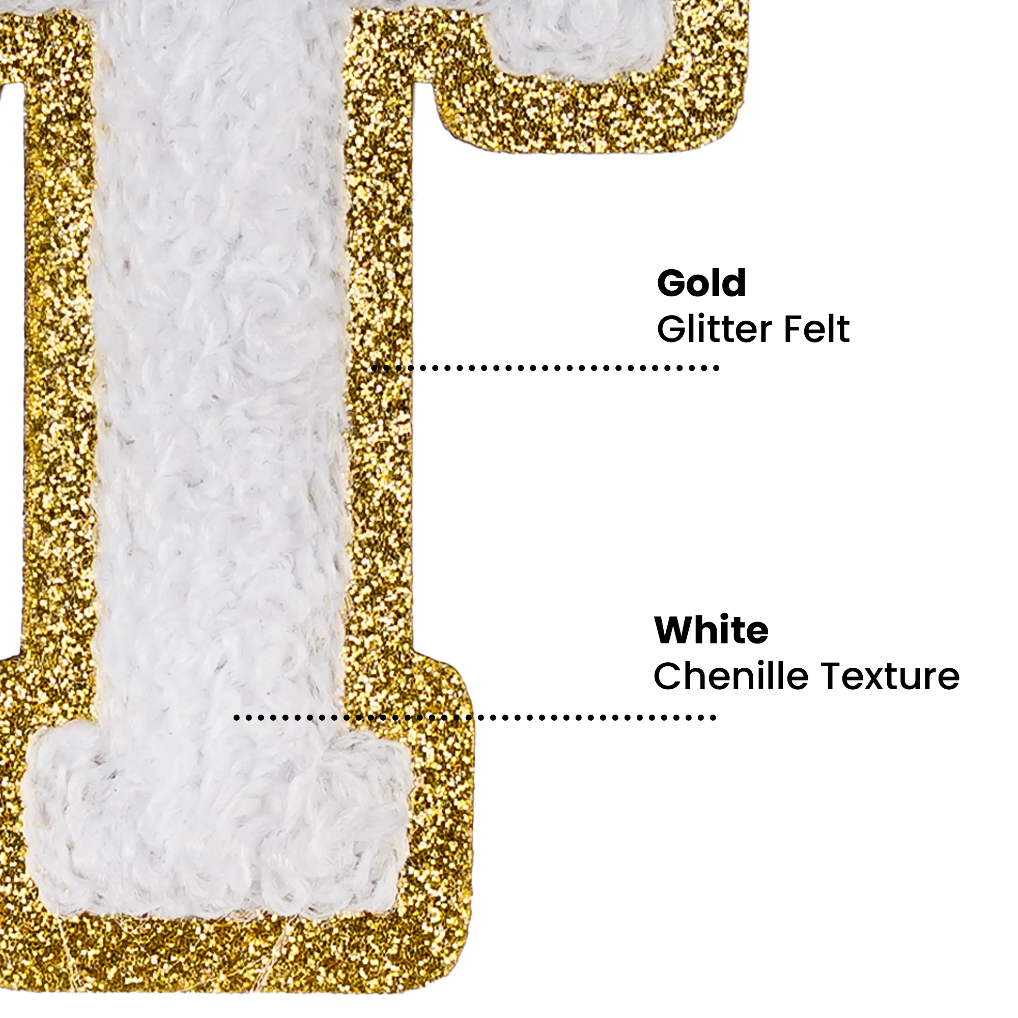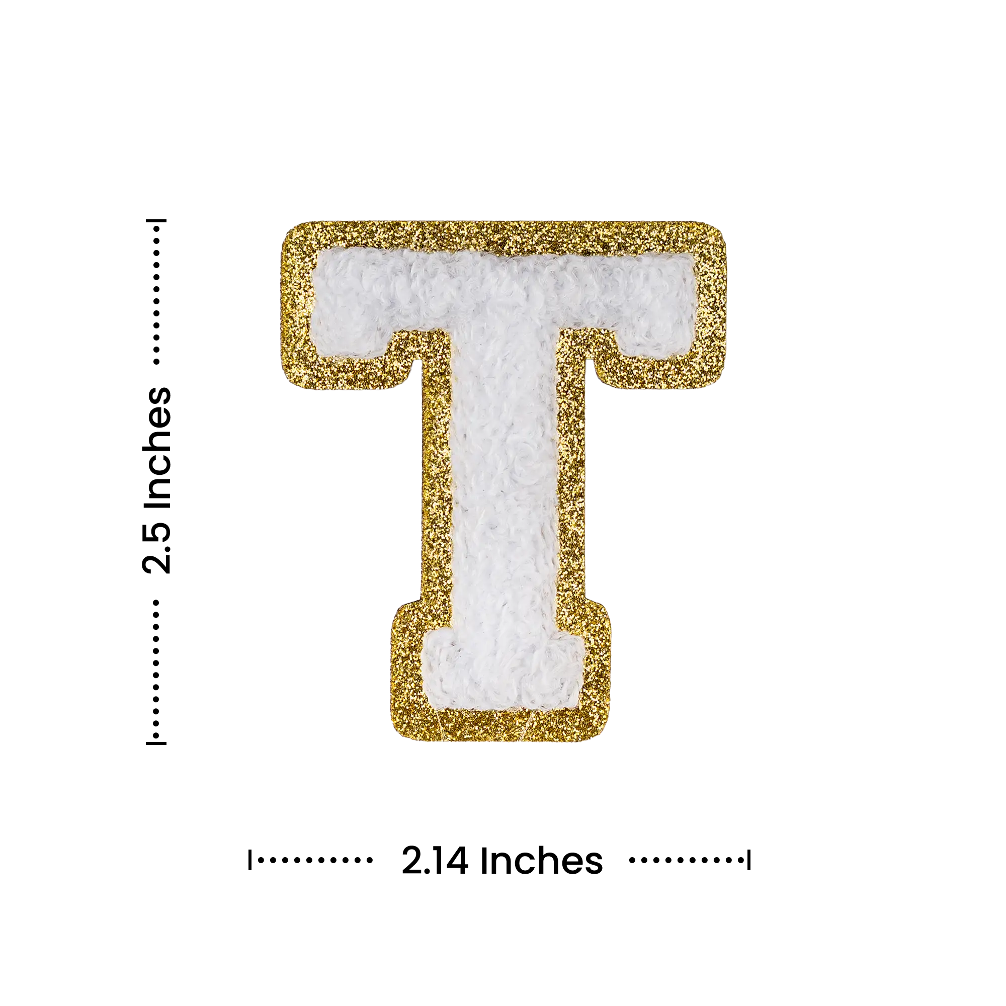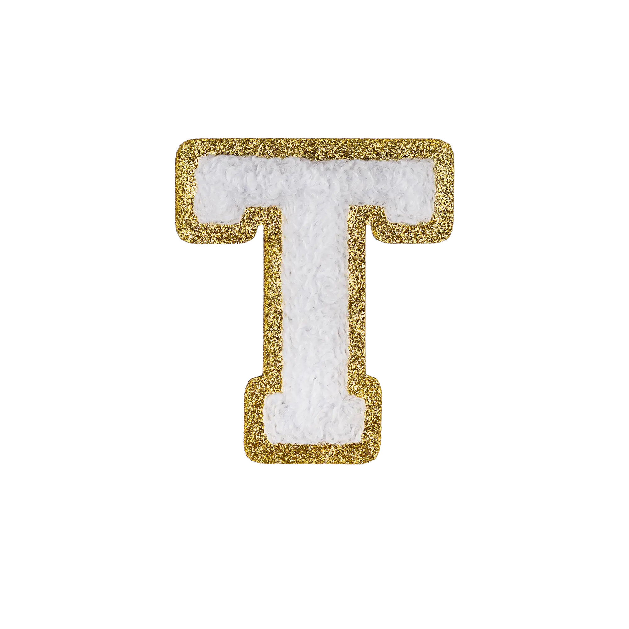 Pack of 25 - 2.5" - Chenille Letterman "T" Patch - White Chenille Thread/Gold Glitter Felt - Peel & Stick Backing
