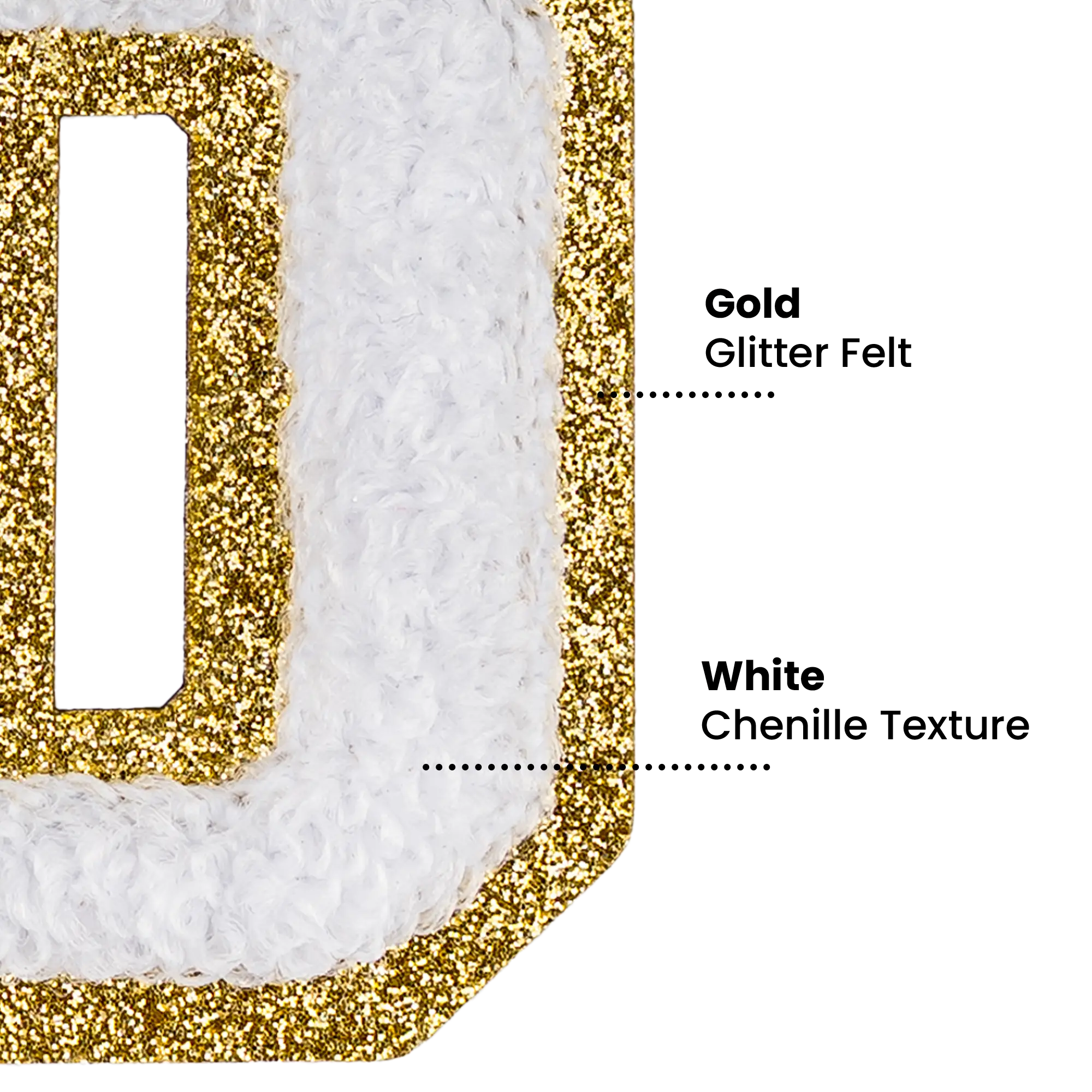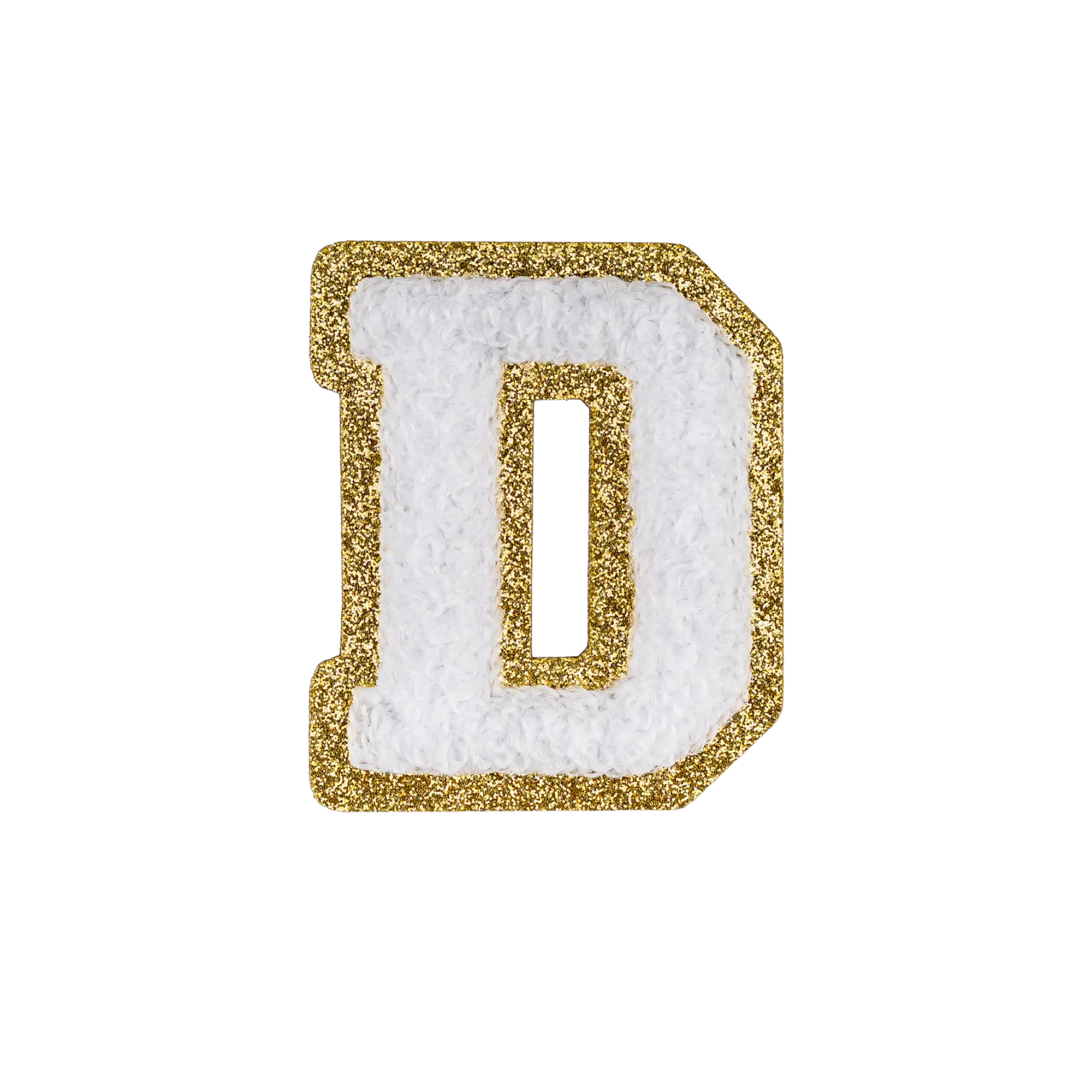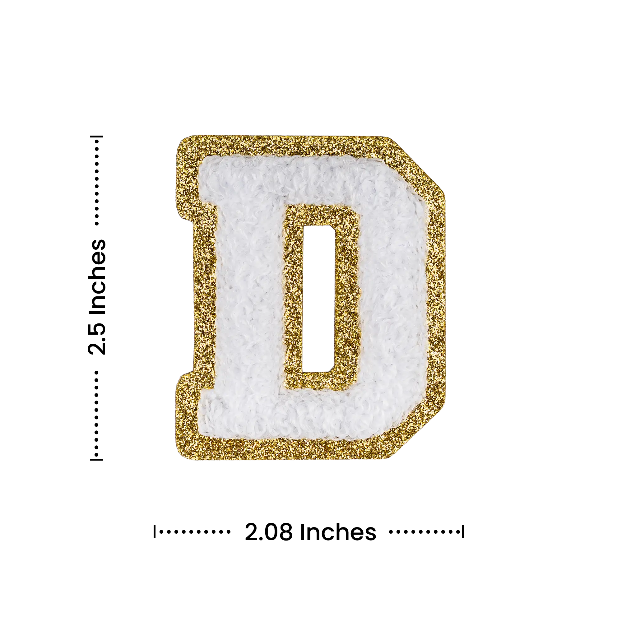 2.5" - Chenille Letterman "D" Patch - White Chenille Thread/Gold Glitter Felt - Peel & Stick Backing