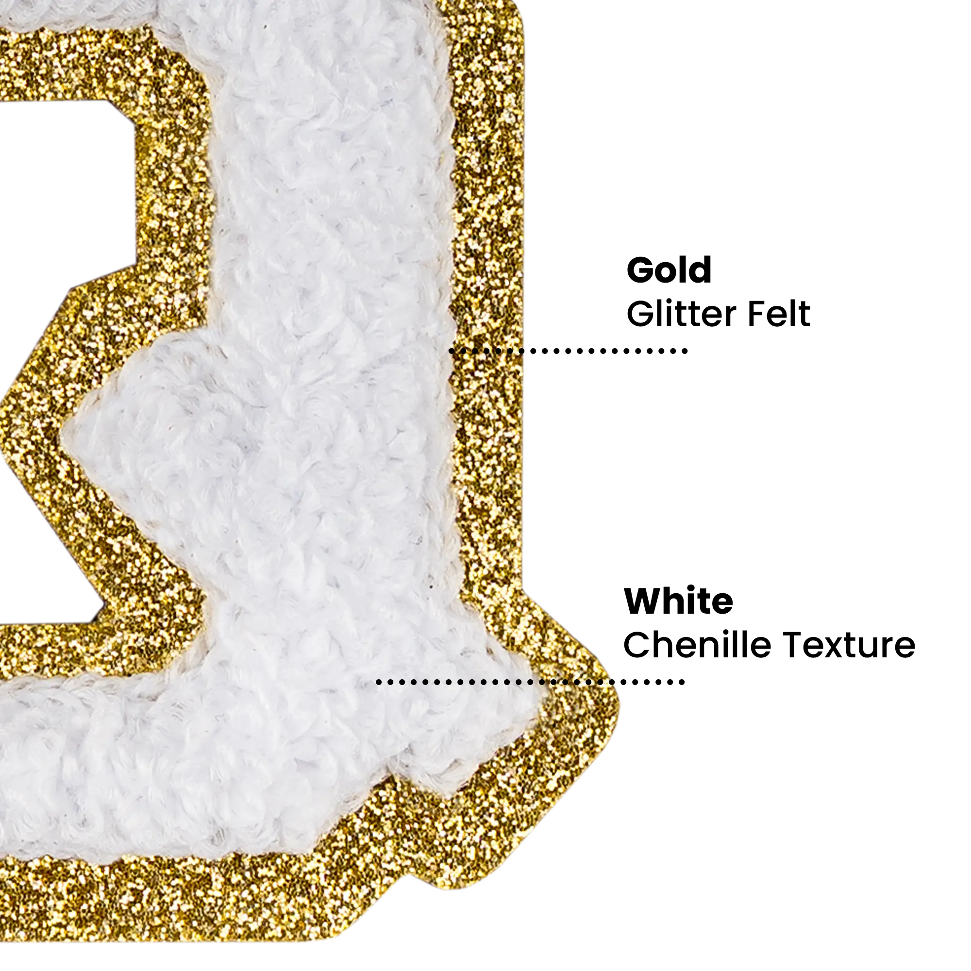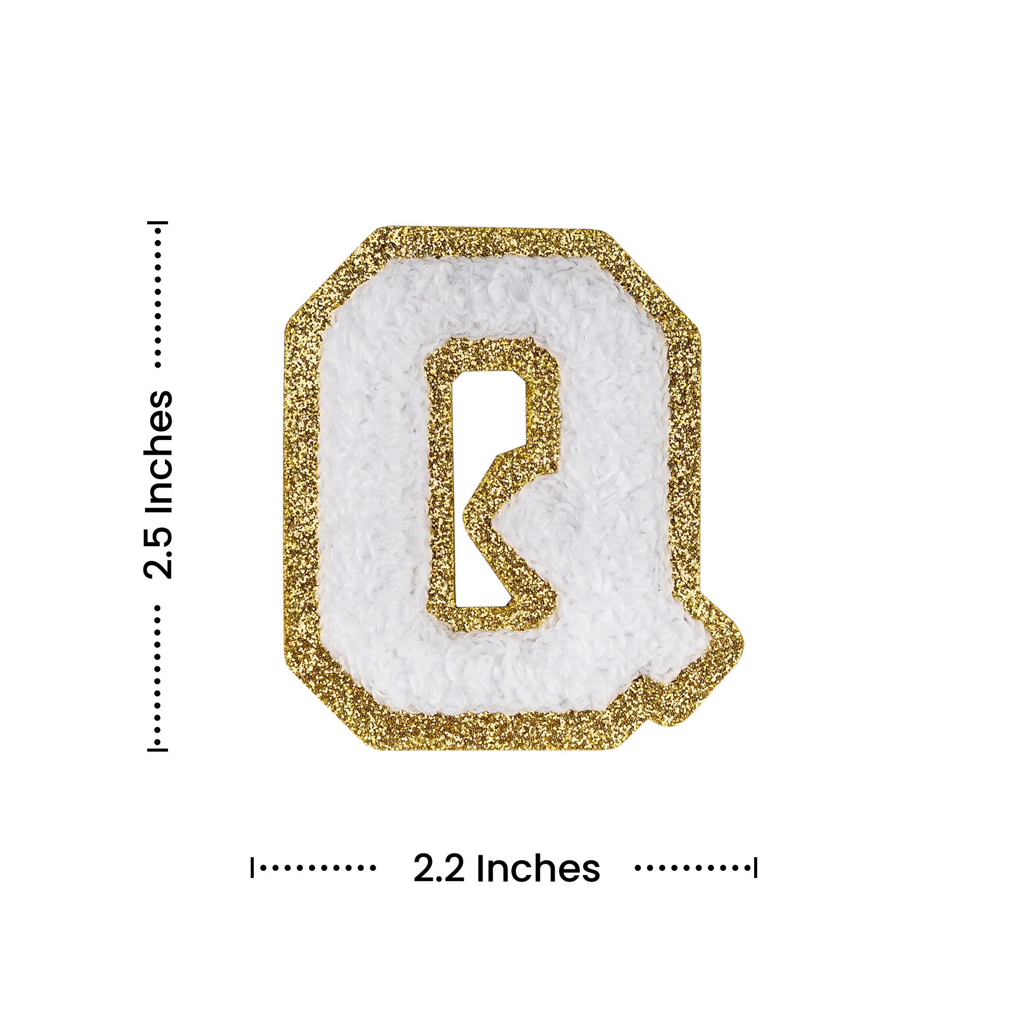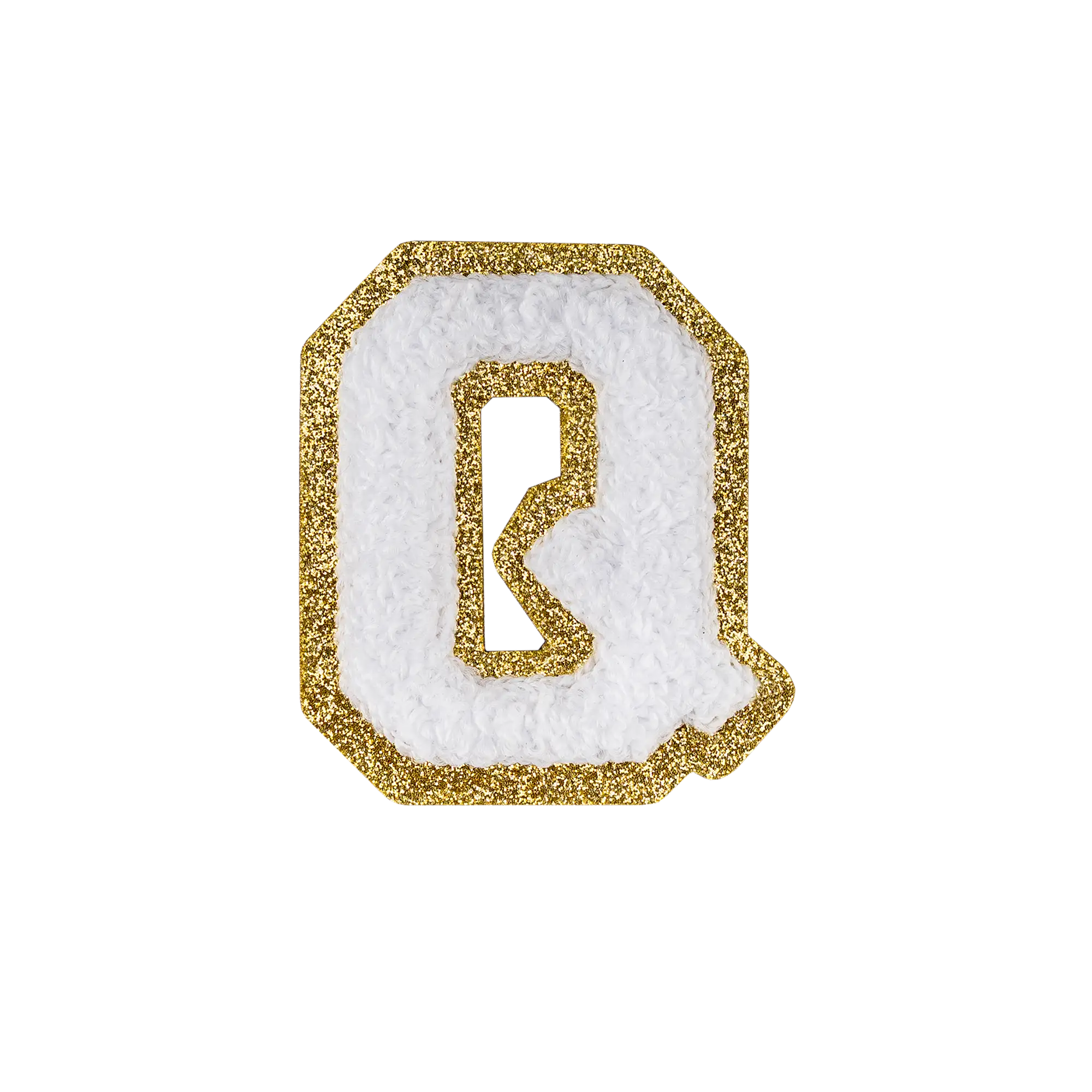 2.5" - Chenille Letterman "Q" Patch - White Chenille Thread/Gold Glitter Felt - Peel & Stick Backing